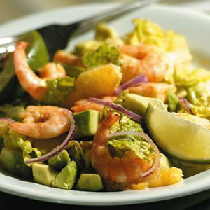 The flavors of a margarita - tequila, orange and lime - are blended in a tossed salad of fresh shrimp, diced avocado and sliced red onion, spiked with a creamy, spicy sour cream dressing. Don't shy away from avocados because they're high in calories - avocados are rich in good, heart-healthy fat, as well as vitamin E, folate, potassium and other important nutrients.