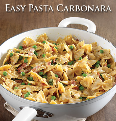 Stack bacon and cut in half lengthwise, then cut crosswise in small pieces. Cook bacon in 11 or 12 inch skillet over medium heat 4-5 minutes or until browned. Meanwhile, finely chop onion. Add onion, garlic and pepper flakes to skillet. Cook another 3-4 minutes or until onion is tender. Add pasta, stock and evaporated milk. Cover and simmer (Do not boil). Simmer 12-14 minutes or until pasta is still a little firm, stirring occasionally. Grate parmesan, remove skillet from heat, stir in cream cheese, peas and parmesan. Let stand, covered 5 minutes or until sauce is thick and creamy.