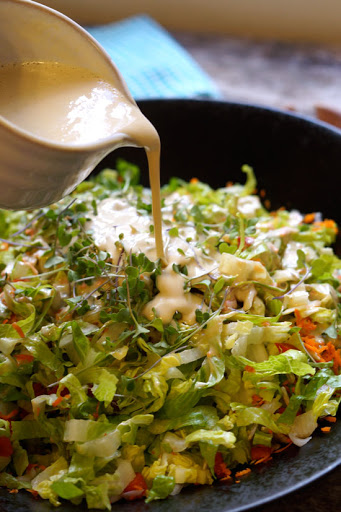 Combine all of the ingredients in a high-speed blender, and blend until completely smooth. Serve over your favorite salad ingredients, including sliced red pepper, shredded cabbage or romaine, fresh cilantro, and some sunflower seeds for crunch.
