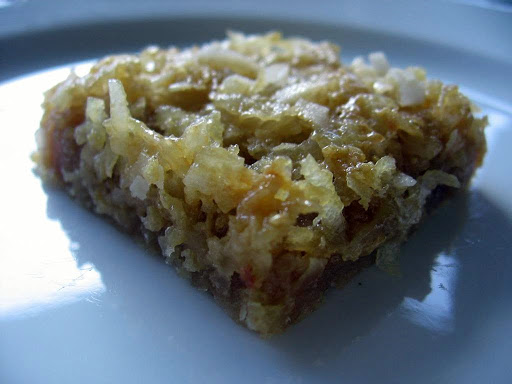 Meanwhile, make filling. Mix together the eggs, 1 cup brown sugar, vanilla, 2 tablespoons flour, and baking powder. Stir in coconut and nuts. Spread onto the crust and bake for 20 minutes longer.