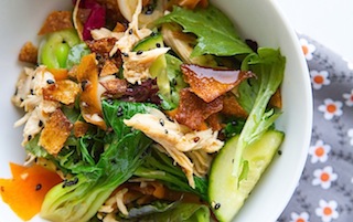 In a large salad bowl add the greens, onions, cucumber slices and chicken. Using a vegetable peeler cut the carrot into ribbons. Add to the salad bowl.