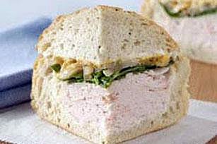 FILL bread shell with layers of turkey, spinach, onions and cheese; cover with top of bread loaf. Wrap in aluminum foil.