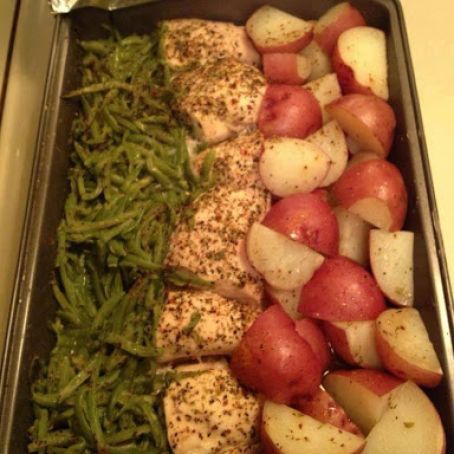 In a 9 x 13 pan, assemble beans, chicken, and potatoes.