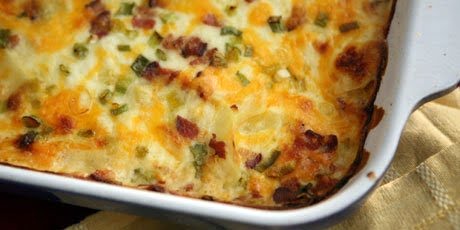 4. Top with another layer of potatoes and continue layering with milk mixture, bacon, green onions, Cheddar cheese, sour cream and potatoes, finishing with a final sprinkling of Cheddar cheese and a few dollops of sour cream. Place a piece of parchment paper, cut to the size of the dish, over top layer and cover dish with foil (or a lid). Bake, covered, for 45 minutes, then remove foil (or lid) and parchment and cook another 20 to 30 minutes, until a knife inserted in the center of the dish yields easily. Let cool for 15 minutes before serving.