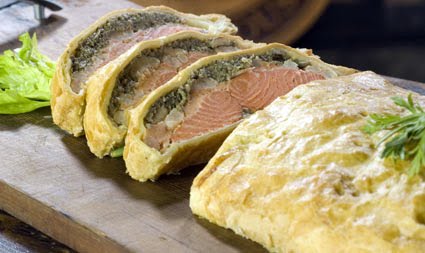 Meanwhile, preheat oven to 425 F. Line a large rimmed baking sheet with parchment paper. On a floured surface, cut block of puff pastry in half (it is usually partially precut.) Roll out each half into a 12x10" rectangle. Place one rectangle on prepared baking sheet. Rinse salmon and pat dry with paper towels. Place salmon in the centre of the pastry, leaving a 2" border all around. Spoon leek mixture over salmon. Brush edges of pastry with egg. Place second pastry rectangle on top and press the edges to seal, like a pillow. Trim the edges, leaving a 1" border of pastry around the fish. Press edges with a fork to seal. Cut 3 or 4 slits in the top to allow steam to escape. Brush top with beaten egg. Bake for 20 to 25 minutes or until pastry is puffy and golden. Let rest for 5 minutes.