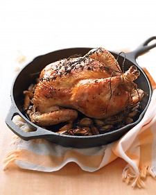 Roast, basting occasionally with juices and stirring garlic, until an instant-read thermometer inserted in thickest part of a thigh (avoiding bone) registers 165 degrees, 45 to 60 minutes. Transfer to a platter, and let rest 10 minutes. Carve chicken, and serve with garlic and pan juices.