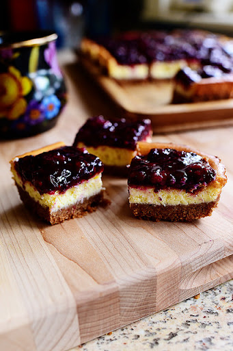 Pour the blackberries over the cheesecake and place the pan into the fridge to chill and set for at least 2 hours. When ready to serve, remove the cheesecake from the pan by lifting the edges of the foil. Peel back the foil and use a long serrated knife to cut cheesecake into squares.