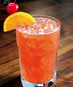 Shake well. Serve in tall glass with ice. Decorate with cherry and slice of orange.