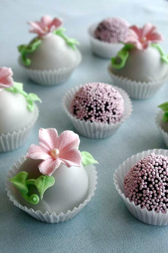 I decorated some of my cake bites with “home-colored” pink sprinkles and covered the rest with poured fondant and decorated them with green vines and some small pink sugar flowers. Placed in paper cups these small cake bites would be a perfect treat for a tea party.