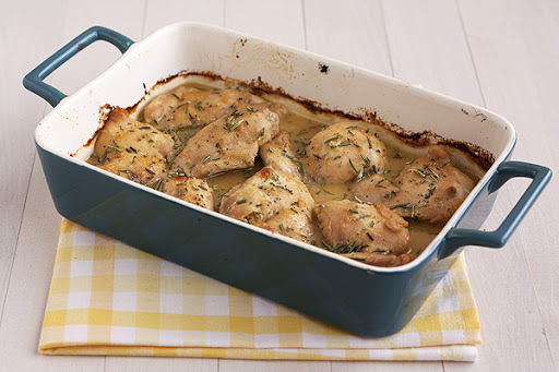 Bake for 40 minutes, or until meat is slightly browned and registers an internal temperature of 165°F. Baste chicken with juices halfway through cooking time. Sprinkle cooked chicken with rosemary and allow to rest for 5 minutes before serving.
