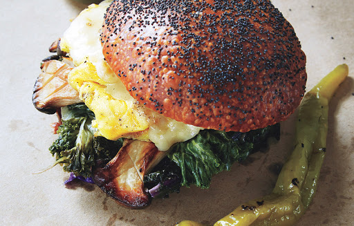 Heat broiler. Spread cut sides of rolls with mushroom mayo (you may have some left over). Place rolls, cut side up, on a broilerproof rimmed baking sheet. Layer bottom halves of rolls with marinated mushrooms, kale mixture, scrambled eggs, and cheese. Broil until cheese is melted.