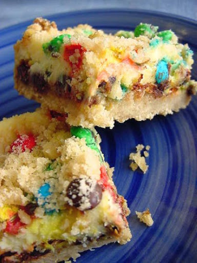 Layer 1/2 cup of the Smarties or M&M candies over the crust; top with the cream cheese mixture.