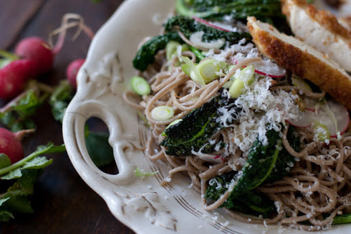 Add the olive oil (and bit of salt) to a large skillet over med-high heat. Stir in the green onions, chard, and cook for a minute until the chard collapses. Stir in the soba noodles. Stir in the garlic powder and Parmesan. Remove from heat. Sprinkle with sliced radishes. Serve family-style or on individual plates - each nest of noodles topped with some of the tofu slices.