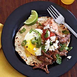 4. Place 2 tortillas on each of 4 plates, and top each tortilla with 2 tablespoons bean mixture. Top beans with 2 tablespoons Beef Barbacoa. Place 1 poached egg on each plate so it overlaps both tortillas. Top each serving with 1 tablespoon remaining salsa. Sprinkle each serving with 2 tablespoons cheese, 1 tablespoon green onions, and 1 tablespoon fresh cilantro. Serve with lime wedges.