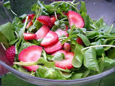 Mix all ingredients in a large salad bowl. Keeping special attention to mix the nuts in the spinach, they like to sink to the bottom of the bowl. When ready to serve, pour on the salad dressing just enough to lightly coat the spinach leaves and strawberries. Serve cold.