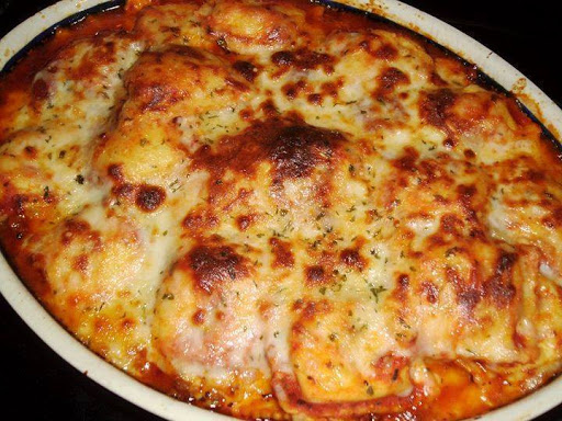 Brown ground beef and drain, add in 1 C. of the pasta sauce, garlic and basil. Remove from heat and set aside. Bring a large pot of water to a boil and cook ravioli according to pkg. directions. Drain and return to pot and add in remaining pasta sauce. Stir to combine. Spray a casserole dish with cooking spray and layer 1/2 of the ravioli in the bottom. Top with all the beef mixture and spread around. Top with 1/2 of the mozzarella cheese and 1/2 of the parmesan cheese. Layer the remaining ravioli on top and top with remaining cheeses. Sprinkle with parsley. Bake at 350 degrees for 20 minutes, turn on the broiler and broil for 2 minutes or until top is browned somewhat.