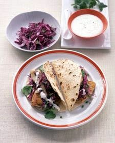 To make tacos, fill tortillas with slaw, fish, and fresh cilantro leaves. Drizzle with reserved sour-cream mixture. Serve immediately.