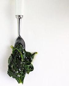 After rinsing the spinach, leave some water clinging to the leaves. This will help the spinach wilt evenly in the pan, without becoming too soft.
