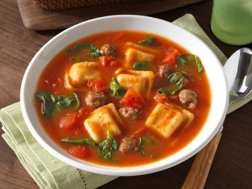 * Bring broth to a boil, add tomatoes and peppers and cook for 1 minute. Add spinach and cook for 2 minutes. Add chicken and pasta and heat through. Put a tablespoon of pesto in the bottom of each bowls, add the soup and top with grated parmigiano reggiano.
