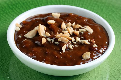 2) Add thick soy sauce, crushed soybean sauce, Hoisin sauce, 4 tablespoons peanut butter and chili garlic sauce. Stir until peanut butter is dissolved and the sauce thickens. Add additional peanut butter until desired thickness is obtained. Adjust seasonings to taste. Garnish sauce with chopped peanuts.