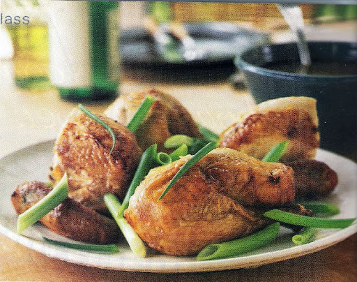 5. Add 1/2 cup reserved marinade to drippings in pan (you should have about 1/4 cup drippings), scraping pan to loosen browned bits. Pour marinade mixture into a small saucepan; bring to a boil, and cook 5 minutes. Stir in sesame oil. Cut chicken into quarters. Drizzle with sesame mixture. Sprinkle with onions.