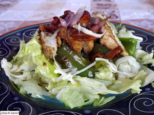 Place the salad greens on a plate and top with the grilled peppers and onions. Top with the sliced chicken and bacon. Drizzle a little of the bacon fat over the salad, and top with the crispy bacon and grated cheese.