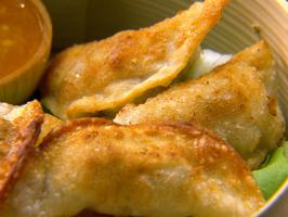 Right before plating, heat a little vegetable oil in a skillet over medium heat and fry the dumplings on both sides until brown, about 3 minutes per side. Garnish with the chives and serve with the peanut and spicy orange sauces.