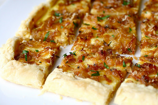 While onion cooks, roll out dough to slightly less than 1/8 inch thick. Cut out 12 rounds with cutter and lightly press each into a mini-muffin cup. Bake until pale golden, 10 to 12 minutes. Remove tartlet shells from muffin pan.