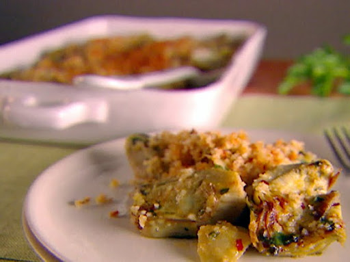 Melt the butter in the same skillet used to cook the artichokes. In a small bowl mix the melted butter with the bread crumbs. Stir in the Parmesan and top the artichokes with the bread crumbs. Bake until the top is golden, about 10 minutes.
