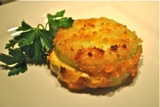 Dredge your stuffed green tomato slices in flour, be sure to coat all sides. Shake off the excess. Dip both sides of the floured tomato in the egg. Now dip the tomato in your Ritz cracker crumbs and coat all sides. If you would like a thicker breading, simply repeat the process starting with the flour.