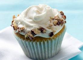 5. Frost cupcakes with frosting. Sprinkle edge of frosted cupcakes with pecans; press lightly into frosting.
