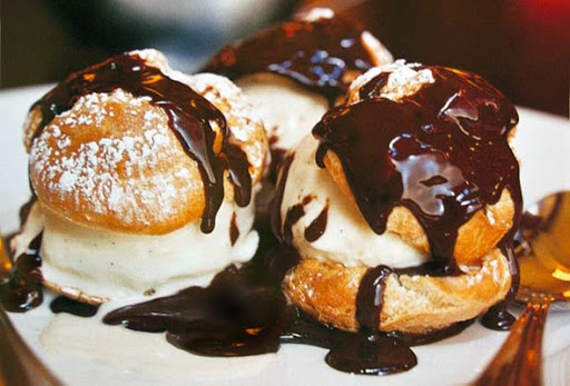 1. Fill the puffs with a scant scoop of ice cream and serve on small plates or in shallow bowls. Pass a pitcher of warm chocolate sauce at the table.