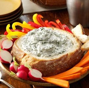 Fill the shell with dip; set on a large platter. Arrange the bread pieces and vegetables around it and serve immediately.