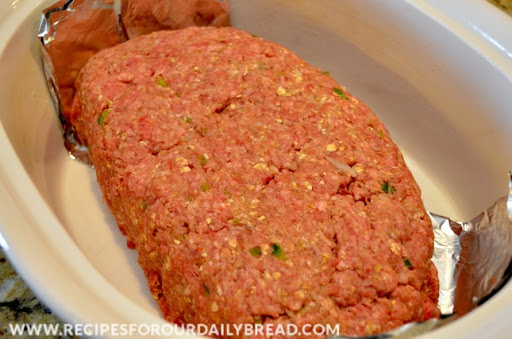 Shape into one large loaf and place it in the center of the crock-pot on top of the foil handles.