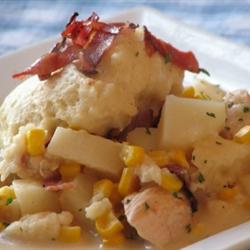 Add potatoes, onion and chicken to bacon drippings and cook for 15 minutes, stirring occasionally. Pour in chicken broth; season with poultry seasoning, salt and pepper. Stir in corn, and simmer all together for 15 minutes.