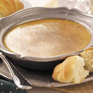 Just before serving, transfer soup to a large saucepan. Cook over medium heat for 5-10 minutes. Stir in the apple juice, cream, salt and pepper; heat through. Yield: 12 servings (about 2 quarts).