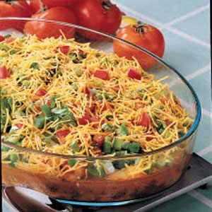 Spread sour cream over the top; sprinkle with lettuce, tomato, green pepper, onions and cheese. Yield: 8 servings.