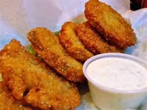 Season tomatoes, on both sides, with salt and pepper. Place flour and garlic powder in a shallow dish. In another shallow dish, beat eggs with the milk. In another dish, mix bread crumbs with cayenne and paprika. Dredge tomatoes through the flour, then the eggs, and then through the bread crumbs. Add only a few pieces to the fryer at a time, so they can cook evenly, about 2 to 3 minutes. Drain on paper towels and serve with Buttermilk Dipping Sauce:
