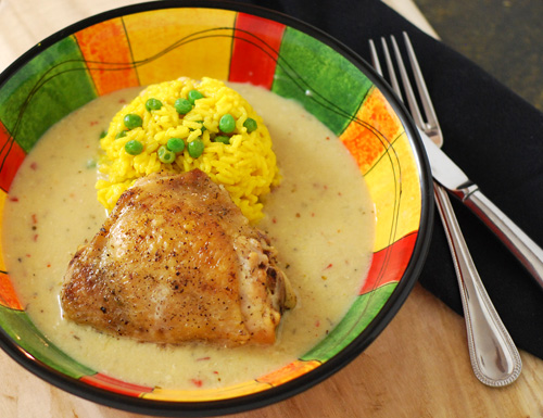 My parents gave me this great bowl set for my birthday over a month ago but I was waiting to come up with something suitable for them. I wanted something Southwestern to match the festive colors but also something that reminded me of my childhood. One of my favorite dishes that my mom made when I was a kid was chicken fricassee. So I took a Southwestern spin on chicken fricassee.