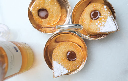 Let dough sit at room temperature to soften slightly, about 5 minutes. Roll dough out between 2 sheets of parchment paper until about ⅛” thick. Cut out rounds with a floured 2½”-diameter cookie cutter. Cut out a circle in half of the rounds with a ¾”-diameter cookie cutter and transfer to 2 parchment-lined baking sheets, spacing 1” apart.