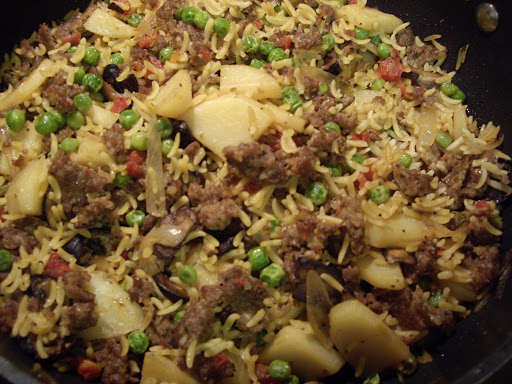 Cook potatoes, Shallots and mushrooms until slightly brown.