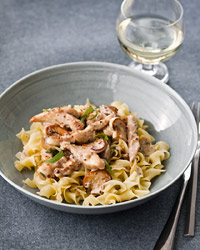 Return the chicken and any accumulated juices to the skillet and simmer over moderate heat until the chicken is cooked through, 2 to 3 minutes; season with salt and pepper. Stir in the tarragon. Serve with buttered noodles.