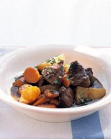 Meanwhile, cook the onions in a medium saucepan of boiling water for 2 minutes. Drain and cool. Peel the onions and cut off the root ends. Add the onions, potatoes, and carrots to the stew. Simmer until the lamb and vegetables are tender, about 25 minutes longer. Season the stew, to taste, with salt and pepper.