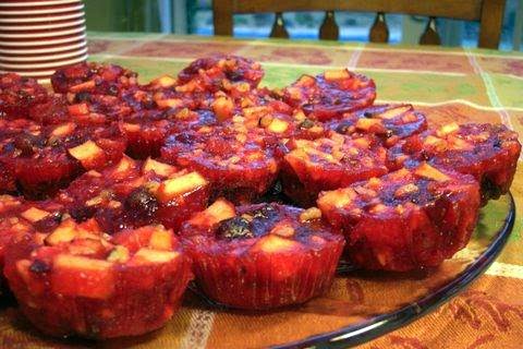 STIR in pineapple, cranberry sauce, nuts and apples. Spoon into 24 paper-lined muffin cups.
