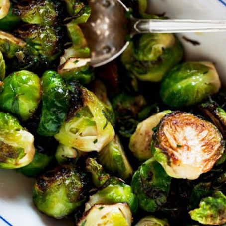 Remove skillet from heat; add maple syrup, butter, and herbs to pan. Once butter has melted, add brussels sprouts to skillet and toss to coat. Transfer brussels sprouts mixture to a large serving platter and drizzle lightly with oil.