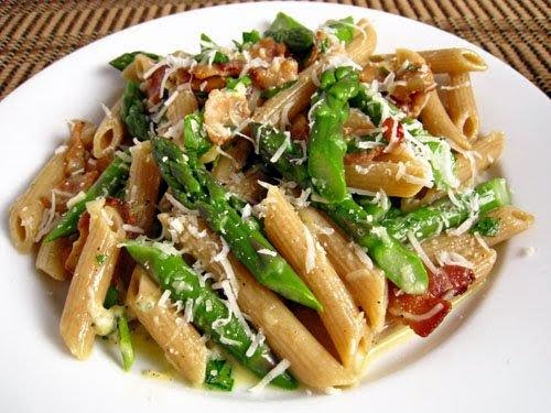 5. Add the asparagus, garlic and pepper and toss to coat in the bacon grease.