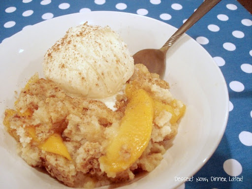Sprinkle cake mix on top of peaches, making sure to crush any large clumps. Sprinkle more cinnamon on top of cake mix. Top cake mix with oatmeal packet & cut butter into 14-16 pieces & place evenly over the top.