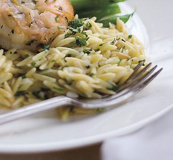 Melt butter in heavy large saucepan over medium heat. Add shallots and garlic. Sauté until shallots are tender, about 5 minutes. Add orzo; sauté 5 minutes. Mix in 6 cups boiling water and salt. Simmer uncovered until orzo is tender, liquid is absorbed, and risotto is creamy, stirring often, about 18 minutes. Remove from heat. Mix in thyme and peel, then parsley.