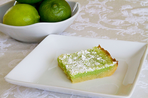 Reduce the heat to 300 degrees. In another medium bowl, mix together the eggs, sugar, flour, salt, tequila, triple sec, and lime juice and zest, and food coloring. Pour the filling mixture over the warm crust and bake another 20-25 minutes.