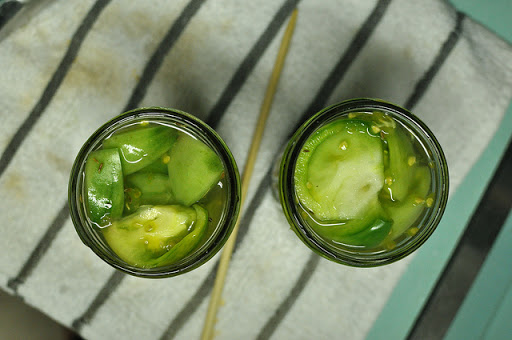 For those of you who are suffering from a fate similar to my parents’, with mountains of green tomatoes heaped upon all available surfaces, I offer up this little recipe. My proportions are based upon a single pound of green tomatoes, for as abundant as they are out west, I had a heck of a time finding enough out this way to fill even two 12-ounce jars. A friend out in Lancaster County sent me a few of her spares, but they’ve been entirely absent at my regular haunts.